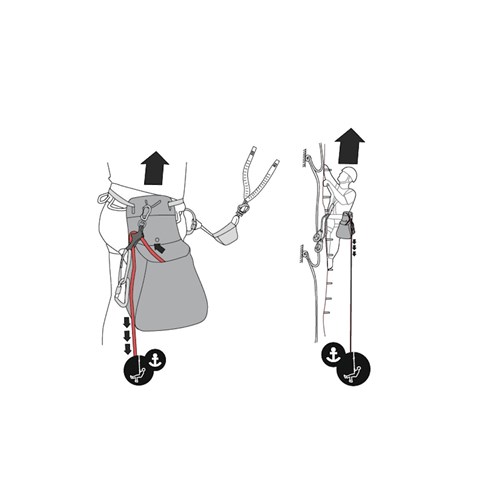 Ergonomiczny plecak z oddzielnym pasem biodrowym zapewnia stabilne dopasowanie do ciała, a jego kształt umożliwia płynne wydawanie i chowanie liny w trakcie wspinaczki. Dodatkowo wyposażono go w czytelną etykietę z instrukcjami bezpieczeństwa, co zwiększa bezpieczeństwo użytkowania.