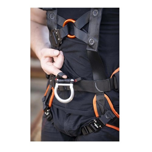 Dolny punkt wpięcia EN 813 wyposażono w dodatkowe pętle do podpięcia siedziska roboczego oraz wewnętrzną pętlę do przyrządu piersiowego – detale, które doceni każdy technik linowy.