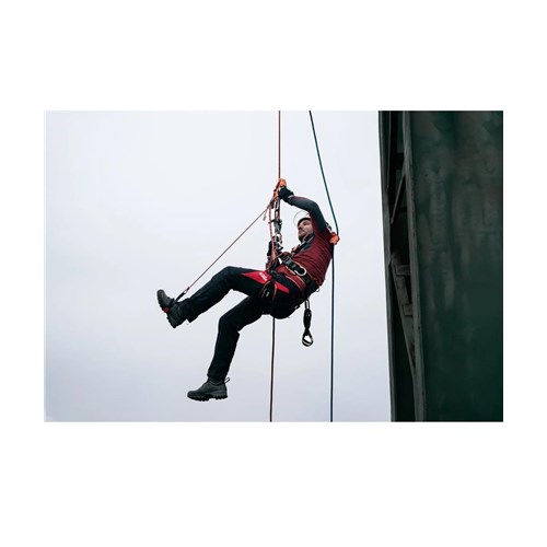 Zakończenie liny wyposażono w zszyty na stałe karabinek, co ułatwia wpięcie do głównej pętli nożnej lub systemu. Wyjmowana pętla na stopę stabilnie trzyma się buta, nie ograniczając ruchów ani komfortu pracy. W razie potrzeby możliwe jest zastosowanie drugiej lonży Step Cord na drugą nogę, co zwiększa efektywność i ergonomię poruszania się po linie.