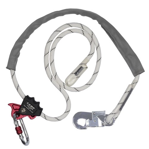 Rope adjuster wykonany jest z 12,5 mm liny statycznej, po której przesuwa się przyrząd zaciskowy pozwalający na regulację długości lonży do 2 metrów. Czerwona przesuwna taśma chroni linę przed przetarciem.