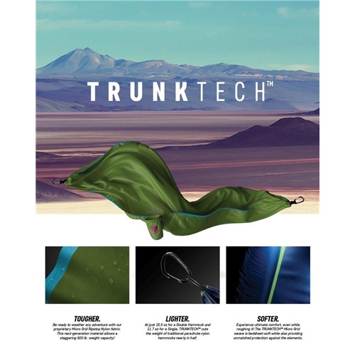 Materiał TrunkTech został stworzony specjalnie do szycia hamaków, jest to zaawansowany technologicznie materiał zapewniający niespotykaną miękkość i wytrzymałość, którą docenią wszyscy użytkownicy.