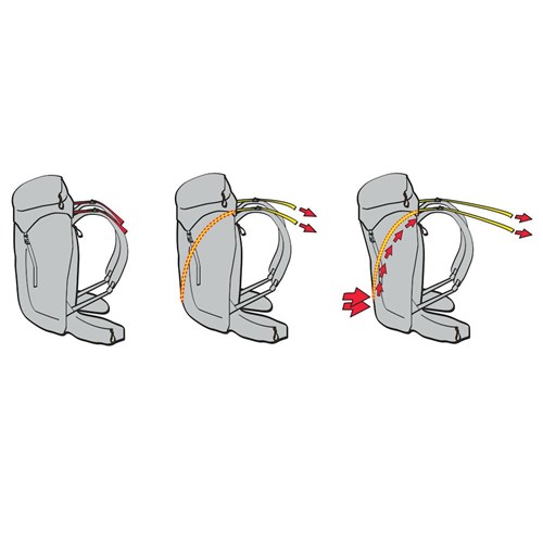 Innowacyjny Balance System łączy funkcje pasków kompresyjnych i stabilizujących w jeden zwarty system. Para pasków przebiegająca od dołu plecaka przez przedni panel aż do klapy i szelek, pozwala jednym pociągnięciem efektywnie skompresować całą zawartość. Zapobiega to przemieszczeniu się przedmiotów w czasie marszu stabilizując cały plecak i zawartość jednocześnie.