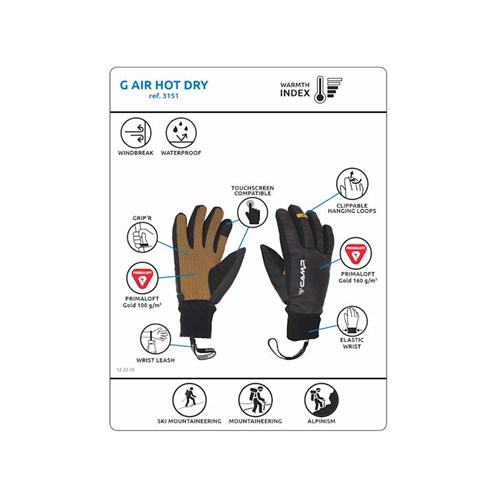 Camp G Air Hot Dry to ciepła i wodoodporna rękawica zaprojektowana do aerobowych aktywności w zimnych warunkach. Izolacja PrimaLoft® Gold 160 g/m² na głównej części oraz PrimaLoft® Gold 100 g/m² na dłoni, w połączeniu z wodoodporną i oddychającą membraną DRYZONE®, zapewnia wysoki poziom ochrony przed wilgocią, wiatrem i zimnem. Konstrukcja z ultralekkich materiałów jest bardzo anatomiczna, co zapewnia wysoką czułość i precyzję manewrów bez konieczności zdejmowania rękawic. Silikonowe podkładki Grip'R na dłoni i palcach gwarantują wyjątkowy chwyt.