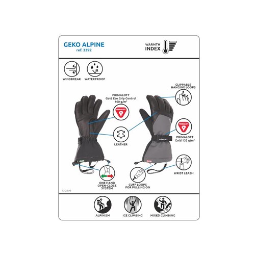 Rękawiczki Camp Geko Alpine zostały zaprojektowane, aby chronić dłonie i utrzymywać je w cieple nawet w najtrudniejszych warunkach, jednocześnie zapewniając wysoki poziom precyzji i wydajności wspinaczkowej. Wydłużone mankiety są zaprojektowane tak, aby można je było naciągnąć na końce rękawów w kurtce, co zapobiega przedostawaniu się zimna, wilgoci czy śniegu, a jednocześnie utrzymuje ciepło. System Open-Close jest łatwy w obsłudze podczas noszenia rękawic, a pasek na rzep na nadgarstku pomaga utrzymać rękawicę na miejscu.