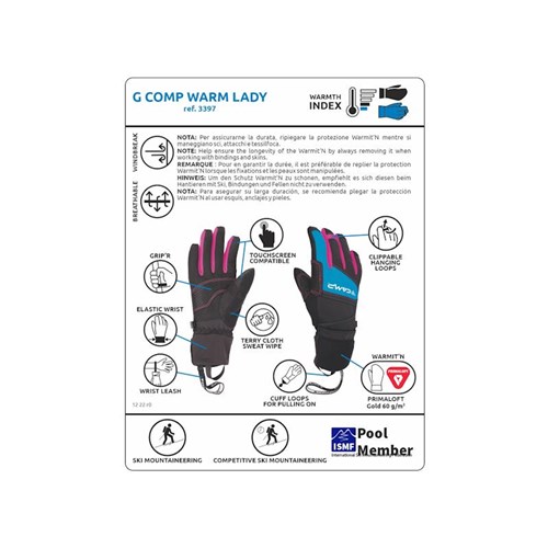 Rękawice Camp G Comp Warm Lady zapewniają wysoki poziom ochrony przed zimnem dzięki specjalnemu ocieplaczowi Warmit’N – lekkiej, izolowanej nakładce na palce wykonanej z wytrzymałego nylonu ripstop oraz ocieplenia PrimaLoft® Gold 60 g/m2. Kiedy nie jest używana, Warmit’N chowa się w mankiecie na nadgarstku, a w razie potrzeby można ją szybko wyciągnąć, aby chronić palce, pozostawiając otwartą dłoń dla lepszego chwytu. Rękawice mają silikonowe wzmocnienia Grip’R na dłoniach dla lepszej przyczepności i trwałości podczas korzystania z kijów.
