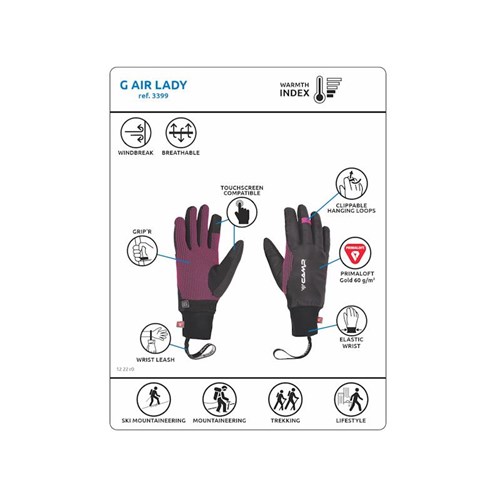 Precyzyjne dopasowanie rękawiczek Camp G Air Lady zapewnia maksymalną czułość, kiedy potrzebujesz zmienić ustawienia kija trekkingowego, zegarka czy innej elektroniki. Główna część rękawicy jest wiatroodporna, podczas gdy nieocieplona dłoń pozostaje oddychająca. Izolacja PrimaLoft® Gold 60 g/m² daje podstawowy poziom ciepła przy jednoczesnym zachowaniu wysokiej oddychalności. Silikonowe podkładki Grip'R na dłoni i palcach gwarantują pewny chwyt.