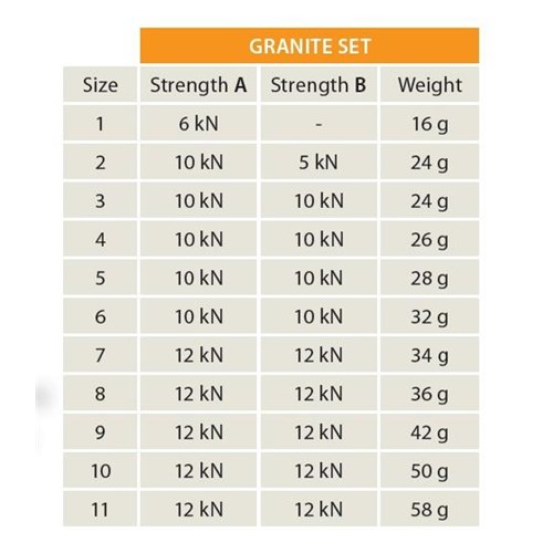 Kości Granite są produkowane z twardego aluminium w jedenastu rozmiarach.