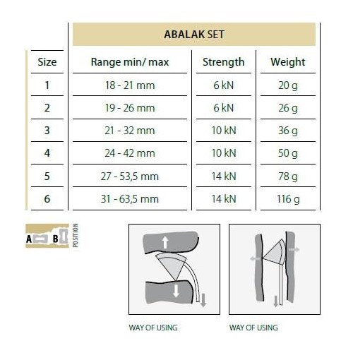 Abalak to czeska wersja angielskich tricamów, prosta i wytrzymała konstrukcja. Abalak można zakładać w rysach, szczelinach skalnych, które mają równoległe boki, poziomo lub pionowo. Abalak sprzedawany jest tylko w zestawie składającym się 6 rozmiarów.